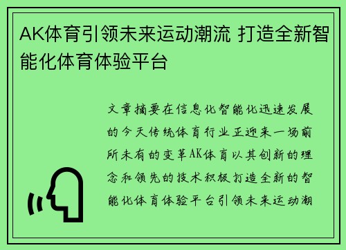 在信息化、智能化迅速发展的今天,传统体育行业正迎来一场前所未有的变革。AK体育以其创新的理念和领先的技术,积极打造全新的智能化体育体验平台,引领未来运动潮流。本文将从四个方面详细探讨AK体育如何利用智能技术推动运动产业的变革,包括智能硬件与体育的结合、数据分析在运动中的应用、个性化定制服务的创新以及智能体育平台的社区互动功能。这些创新不仅提升了运动体验的科技感,也让运动更加智能化、个性化,为体育产业的未来发展注入了新动能。最后,文章还将总结AK体育的创新模式对整个体育行业未来发展趋势的影响,展望智能化体育平台的无限潜力。